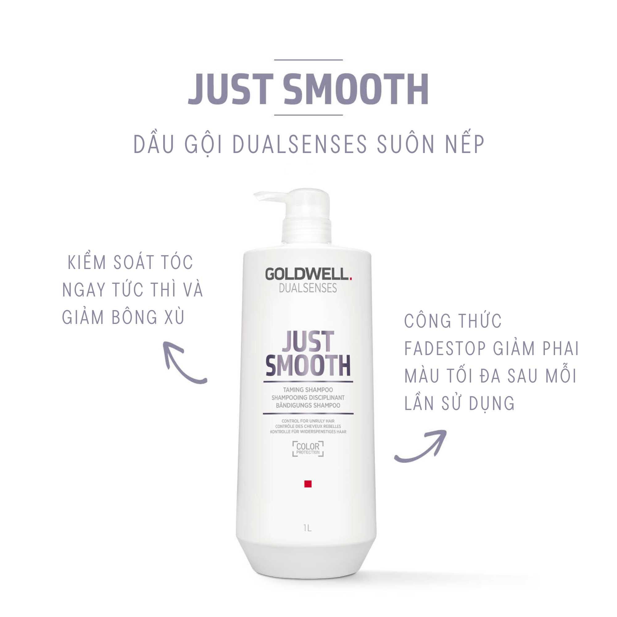 - Với công thức FadeStop dịu nhẹ như nước, dầu gội Goldwell Just Smooth giúp giảm phai màu tối đa trong mỗi lần sử dụng.